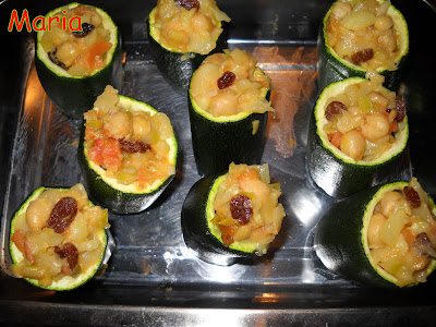 * Agregué a la verdura los garbanzos, las pasas y el queso. Entremezclé todo bien y rellené con esta mezcla los calabacines.